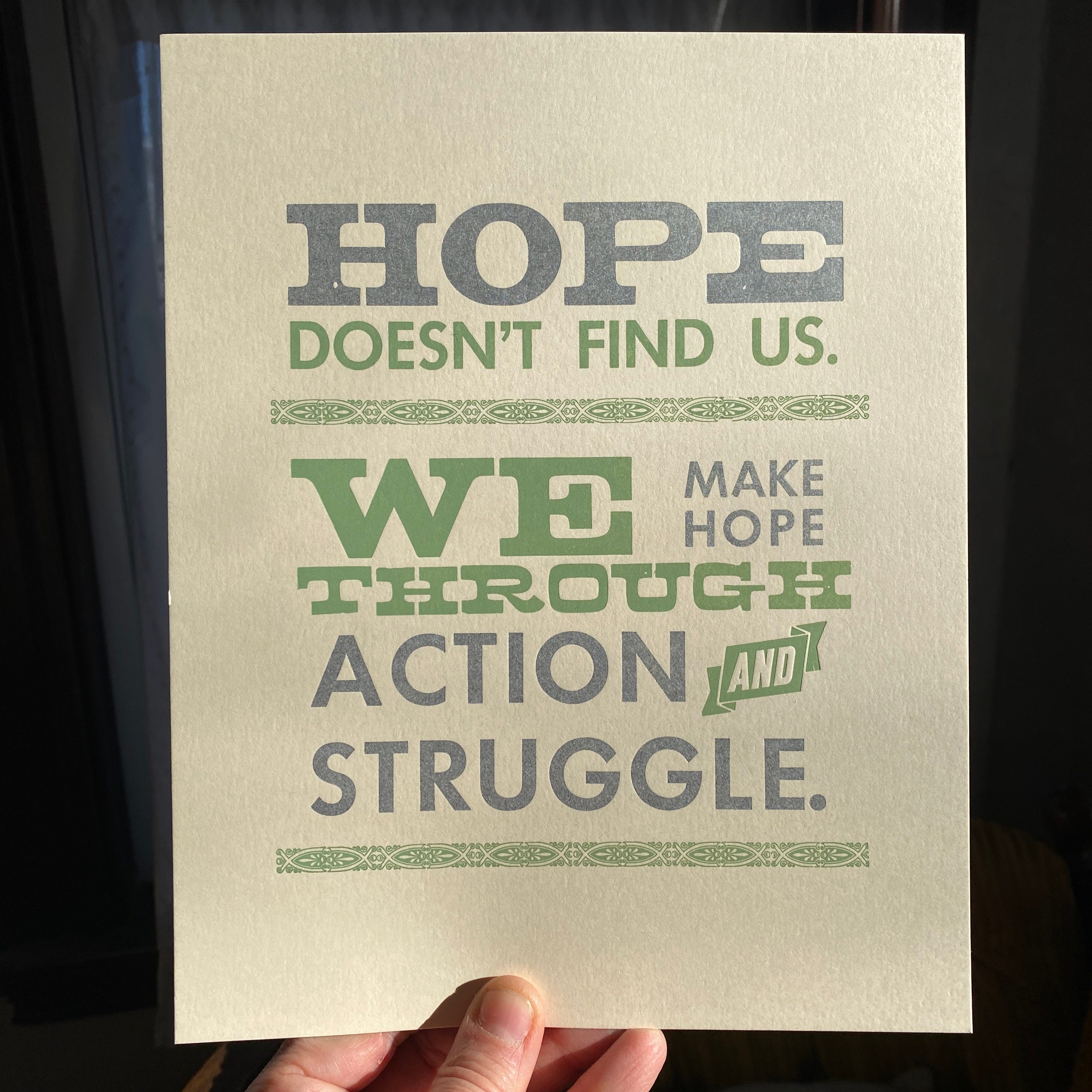 Times are hard and I think that we should send each other gifts without any expectations. I am raffling five (5) letter press prints (8 by 10) by Nicole Manganelli of Radical Emprints (commissioned by me). Anyone who lives in the United States is eligible (international shipping costs are too high unfortunately). The raffle closes on 3/4 at 11:59 pm and the winners will be notified by 3/8. Enter here.