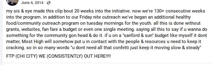 I first learned about Feed the People a couple of years later when Brandon wrote a post on Facebook about the anniversary of when he had first set up on 79th and Cottage Grove. I reached out to offer a monetary donation. Brandon graciously accepted my small contribution. A couple of years later, in 2014, I saw another post on Facebook: