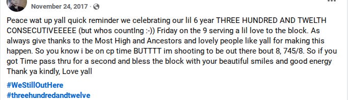 I loved his words: “u don’t need all that confetti just keep it moving slow & steady.” Then again, three years later, he posted about the 312th consecutive week spent handing out homemade food on the corner.
